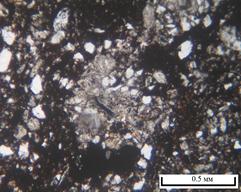 Э310 Песчаник полевошпат-кварцевый. Структура псаммитовая, текстура массивная. Обломочная часть, занимающая от 50 до 60% площади шлифа, представлена кварцем (40 - 50%) и калиевым полевым шпатом. Кварц по шлифу распространен не равномерно. Зерна преимущественно средне окатанные, хорошо окатанных мало, не окатанных практически нет. У некоторых окатанных зерен развиты регенерационные каймы. Так же встречаются обломки базальтоидов (рис.2.2.2). Цемент, занимающий 7–10 % площади шлифа, поровый, глинистого состава. Акцессорные минералы: турмалин, циркон.