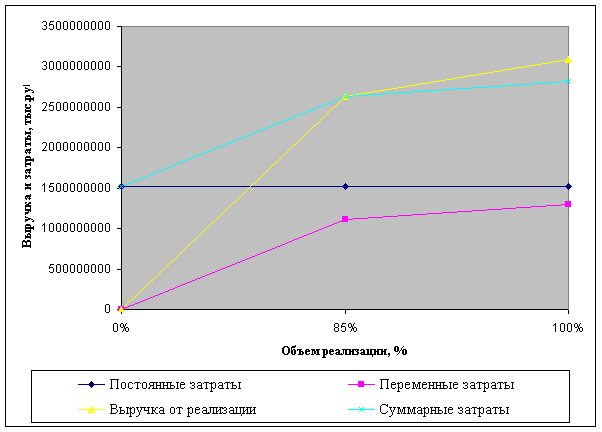 Как видно из расчетов произведенных в таблице 15, за 1996 год нужно было реализовать продукции на сумму 2386915333 тыс.руб., чтобы покрыть все затраты. При такой выручке рентабельност равна нулю. Фактически выручка составила 2715067289 тыс.руб., что выше порога рентабельности на 328151956 тыс.руб., или на 12%. Это и есть запас финансовой устойчивости. За 1997 год запас финансовой устойчивости увеличился до 15% за счет существенного роста рентабельности продаж. Но все же запас финансовой устойчивости продолжает оставаться на сравнительно низком уровне, так как уже при падении выручки всего на 15% рентабельность будет равна нулю. При еще большем падении выручки предприятие станет убыточным.