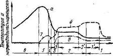 Как мы уже видели, на нефтеотдачу пласта при нагнетании горячей воды влияет большое число факторов и учет влияния каждого из них затруднителен. Приближенными методами расчета нефтеотдачи учитывается только зависимость вязкости нефти и воды от температуры. По расчетным данным, при нагнетании горячей воды (£=170°С) прирост нефтеотдачи достигает 16—17 % при высокой начальной вязкости нефти (250— 300 мПа • с) и продолжительности процесса не менее 8—10 лет. Для нефтей с вязкостью 151 и 32,6 мПа-с соответствующие приросты нефтеотдачи составят 8—11 и 4—5 %. Если в пласт нагнетается водяной пар, схема распространения тепла в коллекторе и процесс вытеснения нефти более сложны, чем при движении в нем горячей воды. Схематический график распределения температуры в пласте при нагнетании в него перегретого водяного пара приведен на рис. На грев пласта вначале происходит за счет теплоты перегрева. При этом температура (конец зоны ) снижается до температуры насыщенного пара (т. е. до точки кипения воды при пластовом давлении). На нагрев пласта (в зоне 2) расходуется скрытая теплота парообразования и далее пар конденсируется. В этой зоне температуры пароводяной смеси и пласта будут равны температуре насыщенного пара, пока используется вся скрытая теплота парообразования. В зоне 3 пласт нагревается за счет теплоты горячей воды (конденсата) до тех пор, пока температура ее не упадет до начальной температуры пласта. Нефть вытесняется (зона 4) остывшим конденсатом. Часть теплоты, как и в случае нагнетания горячей воды, расходуется через кровлю и подошву пласта. Кроме того, на распределение температуры влияет изменение пластового давления по мере удаления теплоносителя от нагнетательной скважины. В соответствии с распределением температуры нефть подвергается воздействию холодной воды, горячего конденсата и насыщенного и перегретого пара. Следовательно, механизм проявления теплоносителя, наблюдавшийся при нагнетании в пласт горячей воды, сохранится и при вытеснении нефти перегретым паром. Увеличению нефтеотдачи также способствуют процессы испарения под действием пара нагретой нефти и фильтрации части углеводородов в парообразном состоянии. В холодной зоне пары конденсируются, обогащая нефть легкими компонентами и вытесняя ее как растворитель. Процесс вытеснения нефти из пласта перегретым паром эффективнее, чем горячей водой, так как пар содержит больше теплоты, чем вода.