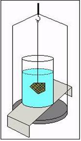После остывания парафина образец вместе с проволочкой взвешивают (М5). Запарафинированный образец взвешивают в дистиллированной воде (М6), как показано на рисунке 2. Для этого над чашкой весов устанавливают мостик со стаканчиком воды, в которую погружают образец, подвешиваемый на проволоке к крюку коромысла весов, следя, чтобы образец не касался стенок сосуда. При этом необходимо следить, чтобы на поверхности парафина не было приставших пузырьков воздуха.