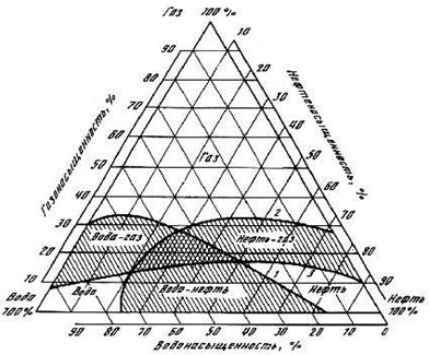 Фазовая (эффективная), относительная проницаемости, насыщенность горных пород определяются экспериментально. Опытами установлено, что в зависимости от объёмного насыщения порового пространства различными компонентами возможно одно-, двух- и трёхфазное движение. Результаты исследования представлены в виде треугольной диаграммы (рис. 7).