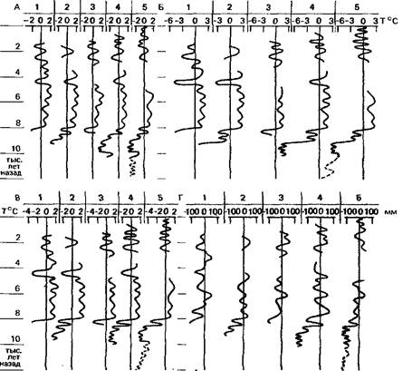 Большой интерес представляют характеристики климата периода голоцена и в особенности периода климатического оптимума на территории нашей страны. Так, в работе В.А. Климанова и Г.А. Единой (255) приведены реконструкции палеотемператур и осадков на протяжении всего голоцена для северо-западной части Русской равнины.