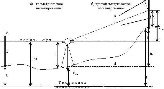 При тахеометрической съемке высоты реечных точек в зависимости от условий местности получают при горизонтальном визировании (геометрическое нивелирование способом "вперед") или наклоном (тригонометрическое нивелирование). Используемые при этом формулы могут быть получены из рис. 41.2.