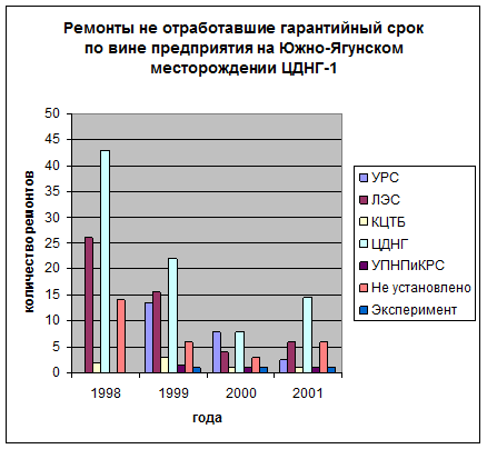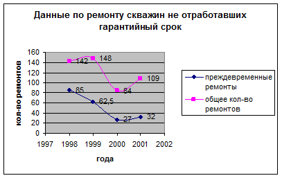 Из рисунка 5.2 видно, что количество скважин не отработавших гарантийный срок в период с 1998 по 2001 год значительно сократилось.