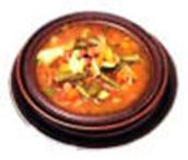 Из масла, лука, молотого красного перца и кинзы сделать зажарку. В нее положить мясо, нарезанное порционными кусками и протушить 10-15 минут, затем положить мелко нарезанные помидоры или пасту, посолить чесночной солью и еще потушить 10-15 минут. Разрезанную кусками капусту вместе с сердцевиной также заложить в мясо. Добавить зелень, горький и сладкий перец и довести блюдо до готовности.