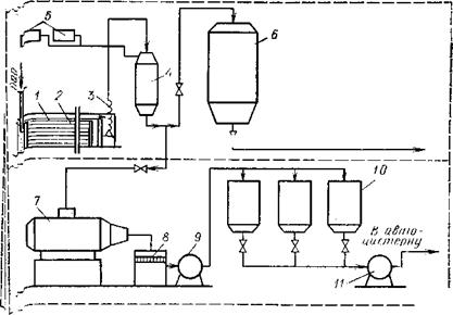 1-участок жироуловителя; // — участок переработки; / — отстойник; 2 — паровые регистры; 3 — гофрированный шланг; 4, 6 — котлы для сбора жира; 5, 9, 11 —насосы; 7 — котел КВМ-4,6; 8 — отстойник жира с отцеживателем; 10 — осветлитель жира.