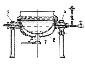 1-открытая емкость; 2-паровая рубашка; 3-съемная крышка; 4-штурвал опрокидывателя; 5-цапфы крепления котла.
