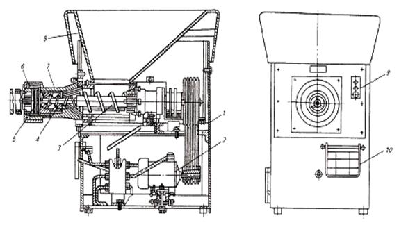 1 – станина; 2 – привод; 3 – подающий шнек; 4 – рабочий шнек; 5 – режущий механизм; 6 – прижимное устройство; 7 – цилиндр; 8 – бункер; 9 – кнопки управления; 10 – откидная площадка.