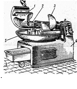 Куттер (рис. 3) состоит из вращающейся чаши 5 (частота вращения чаши 8—14 мин-1), закрытой на 2/з крышкой 1, ножевого вращающегося зала 2 с серповидными ножами (частота вращения вала 1000—2000 мин-1), выгружателя 3.