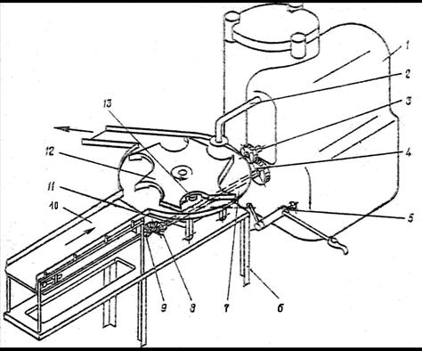 1— шприц CAM-80; 2 — цевка; 3, 4 — зубчатая передача; 5 — фрикцион управления; 6— станина; 7 — рабочий стол; 8 и 9 — коническая зубчатая передача; 10 — ленточный транспортер; 11 — вал передачи; 12 — ротор подачи банок; 13 — механизм блокировки.