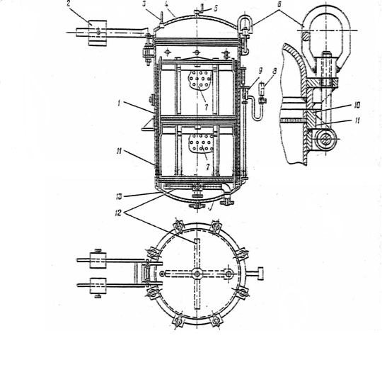 Двухсеточный вертикальный автоклав (рис. 7) представляет собой цилиндрический корпус 1 со сферическим дном 13, оборудованный откидывающейся крышкой 4, снабженной противовесом 2. Герметичность крышки 4 достигается прижимным усилием барашковых гаек 5 и наличием уплотнительной прокладки 10, уложенной в круговой паз 11. Греющий пар подается через барботер 12, установленный в придонной части. Над барботером располагаются корзины 7 с банками.