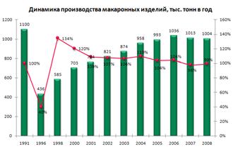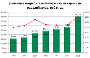 Это хорошо видно на примере лидера макаронного рынка России, и компании занимающей пятое место в мире компании "Макфа". Их объем производства вырос с 93 тыс. тонн в 2002 году, до 173 тыс. тонн в 2008 году.