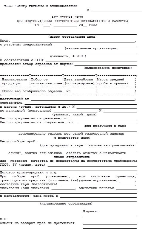 Акт отбора проб для подтверждения соответствия безопасности и качества (муки, хлебобулочных, макаронных изделий)