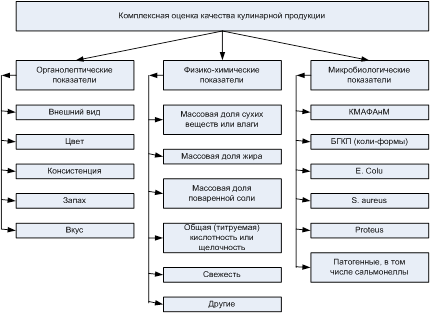 Качество кулинарной продукции оценивают, как правило, по следующим показателям: внешнему виду (в том числе по цвету), консистенции, запаху и вкусу. Для некоторых групп изделий вводят дополнительные показатели: прозрачность (чай, желе), вид на разрезе (мясные, фаршированные изделия, пирожные, кексы и др.), окраска корки и состояние мякиша (хлебобулочные, мучные кондитерские изделия) и др.