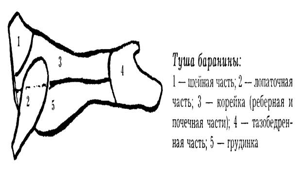 1 — шейная часть; 2 — лопаточная часть; З — корейка (реберная и почечная части); 4 — тазобедренная часть; 5 — грудинка.