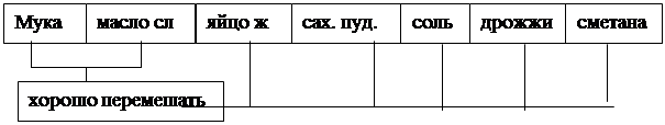 Перемешать все сырье кроме муки и разрыхлителя Всыпать муку и разрыхлитель Замесить тесто Формуют корзинку методом лепки Выпекают Начинить фруктовой и масляной начинкой и белковым кремом |