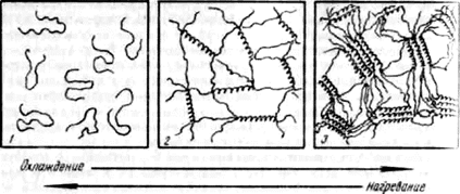 Рисунок 1. Изменение структуры водных систем желатина при нагревании и охлаждении: 1,2 - молекулярно-дисперсная система; 3 - студень с тройными связями.