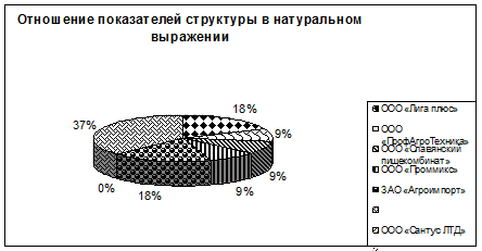 По отношению показателей структуры в натуральном выражении можно определить, что на данном предприятии большую часть ассортимента пряностей занимают пряности следующих производителей: ООО «Лига плюс», ЗАО «Агроимпорт» и ООО «Сантус ЛТД». Это объясняется тем, что данные пряности обладают невысокой стоимостью и более широким ассортиментом.