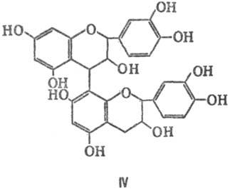 Конденсированные танины представляют собой производные флаванолов, главным образом димеры 3,4-флавандиола или 3-флаванола, например формулы IV (Рисунок 3). Под действием кислот и оснований такие танины не гидролизуются, а образуют нерастворимые, часто окрашенные в красный цвет полимеры; при пиролизе образуют пирокатехин.