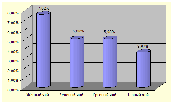 При исследовании выявлено, что самое низкое содержание танина в черном чае, оно составляет 3,67%, тогда как его содержание по литературным данным должно быть не ниже 8%. Это можно объяснить тем, что в черном байховом чае до 40-50% окислено. Также причиной может являться и то, что он пользуется большим спросом у потребителей по сравнению с красным, тем более с желтым чаем (который является одним из самых дорогих и производится в небольших количествах), следовательно, именно его фальсификация наиболее выгодна производителю.