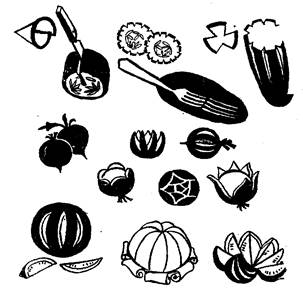 Салатницы все же не следует перегружать зеленью Тюльпанчик из моркови, положенный на красивый лист сельдерея, вполне достаточное украшение для небольшой салатницы. Зеленый лук, связанный в пучок или снопик, хорошо гармонирует с цветком ромашки, сделанным из яйца. Эффектным украшением, является и лук-порей.