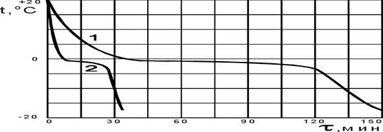На втором этапе происходит переход из жидкой фазы в твердую при температурах от 0 до -5 °С. Работа по отбору тепла у продукта весьма значительна, однако температура продукта практически не снижается, а происходит кристаллизация примерно 70% жидких фракций продукта, которую назовем подмораживанием. На третьем этапе происходит домораживание при температурах продукта от -5 до -18 °С. Снижение температуры опять идет пропорционально выполняемой холодильной машиной работы. Традиционная технология замораживания, реализованная в виде так называемых низкотемпературных холодильных камер, предполагает температуру в камере -18 ? -24 °С. Время заморозки в холодильных камерах составляет 2,5 часа и выше. При замораживании решающую роль приобретает скорость процесса. Установлена тесная связь качества продукта со скоростью замораживания. Многочисленные экспериментальные данные свидетельствуют о влиянии скорости замораживания на размер кристаллов льда, на структурные и ферментативные изменения в продуктах. Идея технологии шоковой заморозки состоит в форсировании режимов охлаждения, подмораживания и домораживания продуктов (см. рис. 1 график 2).