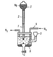 Рис. 1. Простейшая полярографическая ячейка:1 – стеклянный капилляр; 2 – полиэтиленовый шланг; 3 – груша с металлической ртутью; 4 – стеклянная трубочка с оттянутым концом для ввода азота; 5 – воронка для смены раствора;
