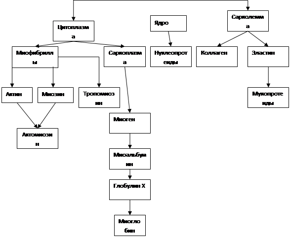 Белки составляют основную часть органических веществ мышечной ткани и главную пищевую ценность ее. По своему строению, свойствам и функциям они различаются друг от друга. Многообразие белков мышечной ткани (мышечного волокна) видно на представленной схеме 1.