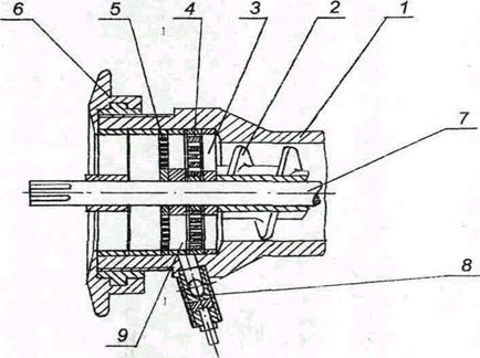 1 - корпус рабочей камеры; 2 - шнек подающий; 3 - ножи; 4 - решетка входная; 5 - решетка выходная; 6 - гайка; 7 - вал; 8 - устройство жиловочное; 9 - нож жиловочный
