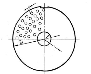Ножевые решетки, используемые в волчке для измельчения мясного сырья, представляют собой диск постоянной толщины с плоской рабочей перфорированной поверхностью, с центральным посадочным отверстием и с круглыми отверстиями перфорации. Решетка представлена на рисунке 3.1.