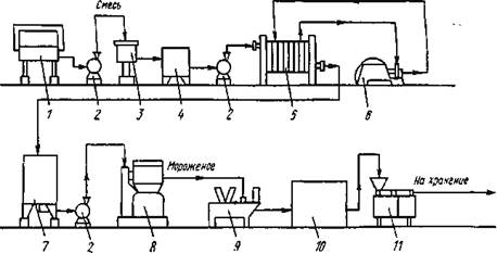 1 — ванна для приготовления смеси; 2 — насос; 3 — фильтр; 4 — уравнительный бак; 5 — пластинчатая пастеризационно-охладительная установка; 6 — гомогенизатор; 7 — емкость для смеси; 8 — фризер; 9 — автомат для фасования мороженого в вафельные стаканчики; 10 — морозильный аппарат; 11 — автомат для завертки мороженого