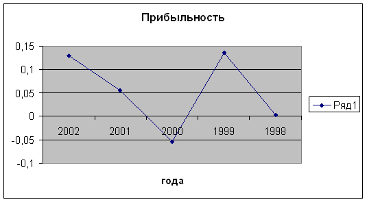 1. Прибыльность. Чистая прибыльность в 2002 году равняется 0,129, что на 134% больше чем в 2001 году, что позволяет говорить о том, что чистая прибыль от чистых продаж увеличивается. Более наглядно это видно на графике.