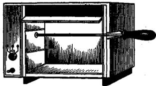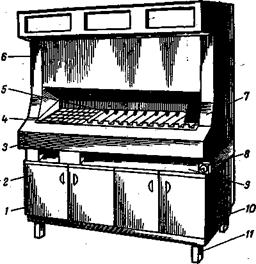 1 – подставка с двумя инвентарными шкафами; 2 – дверцы шкафа; 3 – рабочая камера; 4 – прорези для установки шпажек; 5 – отверстие для закрепления шпажки; 6 – вытяжное устройство; 7 – горн; 8 – выключатель; 9 – зольник; 10 – сварная рама; 11 – регулирующие ножки
