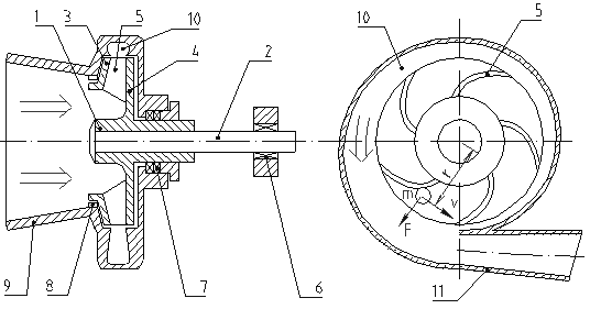 1 - колесо, 2 - вал, 3 - передний диск, 4 - задний диск, 5 - лопасти, 6 - подшипники, 7 и 8 - уплотнения, 9 - подвод, 10 - спиральный отвод, 11 - напорный патрубок.