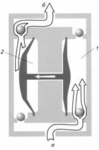 Рисунок 2. Схема мембранного насоса: 1- рабочая камера, 2 – воздушная камера; а – всасывание, б – нагнетание.