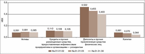 Уровень концентрации активов и капитала в целом по российскому банковскому сектору в 2003 году несколько снизился. При этом доля 200 крупнейших по величине активов кредитных организаций в совокупных активах банковского сектора практически не изменилась и по состоянию на 01.01.04 составила 88,0% (на 01.01.03 — 88,5%). Доля 5 крупнейших банков в активах банковского сектора сократилась за тот же период с 44,2 до 42,9%, в основном за счет уменьE