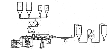 Технологическая линия для производства экструдированных пищевых продуктов (панировочные сухари, суповые добавки, сухие завтраки и т. п.) показана на рисунке 1. В линию входят бункер 1 для основного сырья, бункер 2 для вкусовых добавок, смеситель 3, шнековый дозатор 4, экструдер 6, гранулятор 7, насос-дозатор 5, а также дополнительное оборудование в зависимости от вида получаемого продукта – охладитель 8, промежуточный бункер 9, накопительный бункер 11, (сушильная печь 10, жарочная ванна, ароматизатор и другое оборудование).