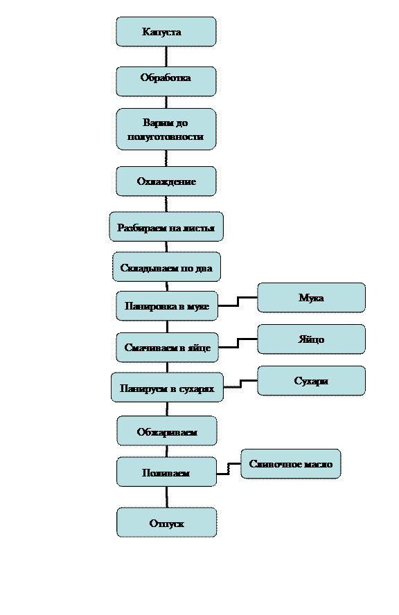 Шницель из капусты. У кочанов капусты вырезают кочерыжку и варят их в подсоленной воде до полуготовности, затем охлаждают, разбирают на листья, срезают утолщенные стебли или отбивают тяпкой. Подготовленные листья складывают по два, придают им овальную форму (заворачивая края внутрь), панируют в муке, смачивают в яйце и панируют в сухарях. Подготовленный полуфабрикат кладут на разогретый с жиром противень, обжаривают с двух сторон и доводят до готовности в жарочном шкафу.