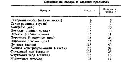 Тому, кто связан с большими физическими нагрузками, можно употреблять по 90—100 г сахара в день. В табл. 2 приводятся данные о содержании сахара в наиболее часто употребляемых сладких продуктах.