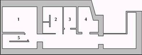 План цокольного этажа 1 - Помещение для холодильных камер, 10 м2 2 - Гардероб, 5 м2 3 - Загрузочный цех, 4,2 м2 4 - Цех подготовки овощей, 5,9 м2 5 - Лестница с подпором воздуха при пожаре