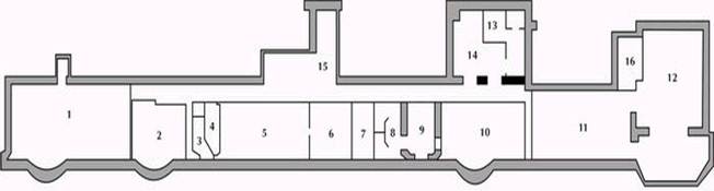 План первого этажа 1 - Зал бистро, 70 м2 2 - Зал кофейни, 23,5 м2 3 - Санузел, 4,7 м2 4 - Водомерный узел, 5,1 м2 5 - Горячий цех, 39 м2 6 - Холодный цех, 14,4 м2 7 - Мясо-рыбный цех, 10,4 м2 8 - Санузел, 5 м2 9 - Гардероб, 24 м2 10 - Первый зал ресторана, 40,5 м2 11 - Второй зал ресторана, 51,8 м2 12 - Третий зал ресторана, 46,8 м2 +21,7 м2 (пристройка) 13 - Сервизная, 5 м2 14 - Моечная, 21,3 м2 15 - Гардероб для персонала, 10,5 м2 16 - Кабинет директора, 5,4 м2