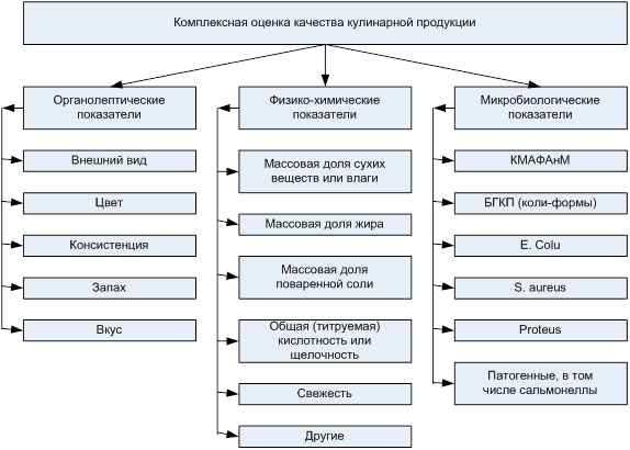 В настоящее время на предприятиях общественного питания в основном качество продукции оценивают по органолептическим показателям (внешний вид, цвет, консистенция, запах, вкус). Для некоторых групп изделий вводят дополнительные показатели: прозрачность (чай, желе), вид на разрезе (мясные, фаршированные изделия, пирожные, кексы и др.), окраска корки и состояние мякиша (хлебобулочные, мучные кондитерские изделия) и др.