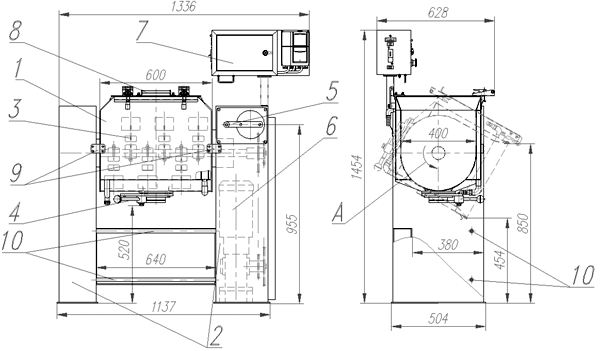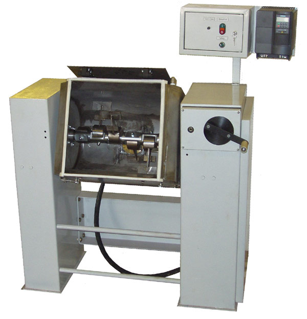 Месильно-сбивальная машина состоит из следующих основных частей: корытообразного бункера поз.1 на двух опорах поз.2 с подшипниковыми узлами; вала поз.3 с рабочими лопастями, проходящего внутри бункера; спускного устройства поз.4 для выгрузки жидкого продукта из бункера поз.1; опрокидывающего механизма поз.5 для переворота бункера и выгрузки вязкого продукта; привода поз.6 и цепной передачи, расположенных внутри правой опоры машины; пульта управления с частотным преобразователем поз.7.