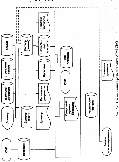 На рис.4 представлена схема данных решения задач АРМ СКО. Сотрудник кредитного отдела, используя множество текстовых прототипов (шаблоны договоров), составляет договор о выдаче кредита также в текстовой форме, имеющий статус черновика. Кредитный договор как текстовый документ содержит: наименование сторон; вид кредита; сумму; срок договора; процентную ставку; порядок выплаты процентов; вид обеспечения; перечень необходимых документов (по требованию банка); номер расчетного счета и другие реквизиты банка, обслуживающего предприятие; юридические адреса сторон.