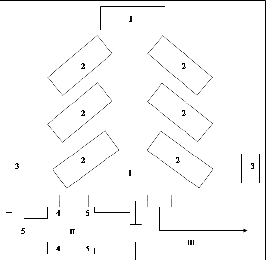 1-Стол для женатых и их близких родственников, всего за столом поместится 4-6 человек; 2-Столы для приглашенных, гости будут размещены, так что бы всем было видно «женатых», за один стол поместится 16 человек; 3-Серванты; 4-Столы для подарков, цветов, бокалов; 5-Низкие диваны.
