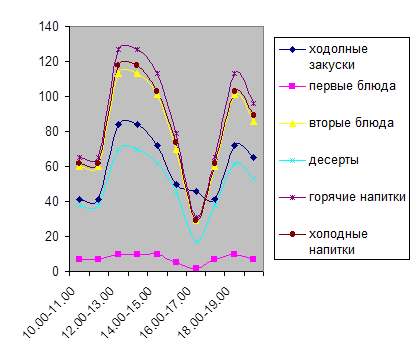 На основании диаграммы загрузки зала и плана-меню количество блюд того или иного наименования за каждый час работы предприятия определяем по формуле: