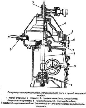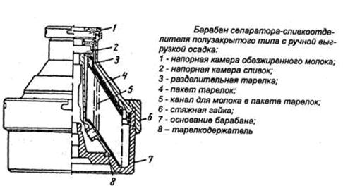В полузакрытых подача молока осуществляется открытым способом, а отвод продуктов – закрытым, под напором, создаваемым барабаном сепаратора. Производительность 0,5-1,0 кг/с.