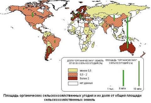В настоящее время органическое сельское хозяйство практикуется почти в 140 странах мира. В 1998 г. в мире насчитывалось около 8 млн. га органических сельскохозяйственных угодий, а в 2006 г. уже более 30 млн. га. Всего в мире более 700 тыс. органических ферм. Лидерами по общей площади органических сельскохозяйственных угодий являются Австралия (12,3 млн. га), Китай (2,3), Аргентина (2,2), США (1,9), Италия (1,1), Уругвай (0,93), Испания (0,93), Бразилия (0,88), Германия (0,83), Великобритания (0,6) (рисунок 1).