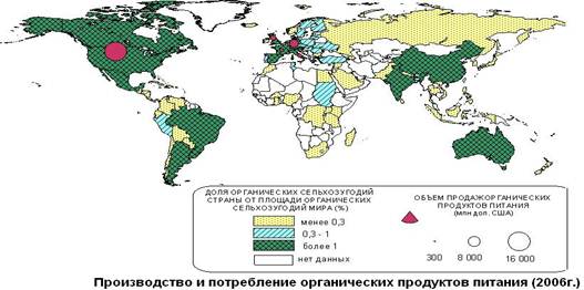Лидером являются США, где ежегодно продается органических продуктов на 13,5 млрд. дол. США (10,3 млрд. евро) при этом только за 2006 г. этот показатель вырос на 11%. На втором месте с большим отрывом находится Германия (3,5 млрд. евро), затем следуют Италия (2,4 млрд. евро), Франция (1,9 млрд. евро), Великобритания (1,8 млрд. евро) и Канада (0,7 млрд. евро). В Азии по данному показателю выделяется Япония с уровнем продаж в 0,4 млрд. евро (10-е место в мире) [20].