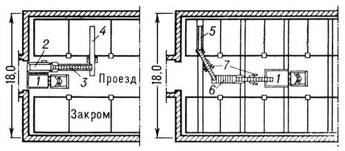 Рис. 2. Схема механизации картофелехранилища: а — загрузка хранилища; б — разгрузка хранилища; 1 — самосвал; 2 — приёмный бункер; 3 — лопастной транспортёр; 4 — загрузчик; 5 — выгрузной транспортёр (помещен в вентиляционном канале); 6 — сортировальная машина; 7 — ленточные транспортёры.